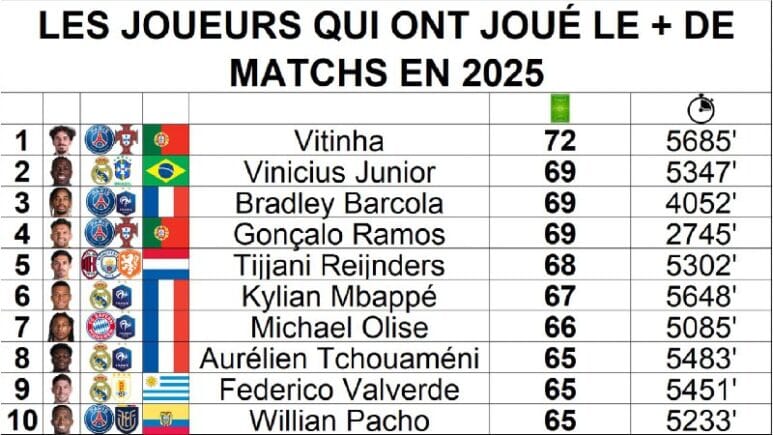📊 • اللاعبون الذين خاضوا أكثر عدد من المباريات والدقائق في عام 2025.